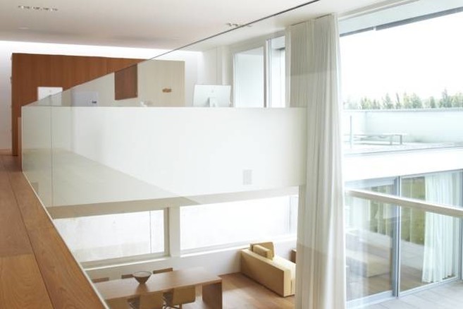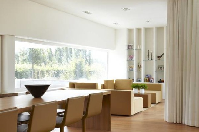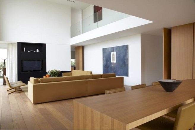 Maar een saaie indruk geeft het interieur alleszins niet. Het monotone kleur- en materiaalgebruik wordt stijlvol doorbroken met een aantal kleine ingrepen, zoals oranje vaasjes op de salontafel.