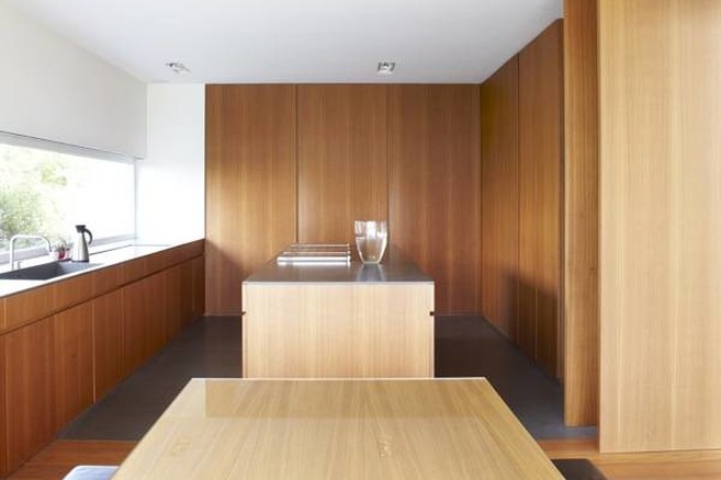 In de keuken komt een andere wens van de eigenaars naar voren: een strakke look. Er staan geen stoelen maar banken aan de tafel, een dampkap ontbreekt – de vuile lucht wordt naast de kookvuren afgevoerd, de kasten zijn greeploos, alle keukenapparaten kunnen weggestopt worden achter teakpanelen die ook dienst doen als deur, het werkblad bestaat uit één stuk … Er is werkelijk aan elk detail gedacht en dat zorgt voor een verbluffend resultaat.