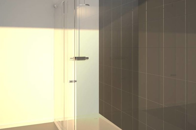 Interessant is dat de volle glaspartij altijd de contouren van de muur volgt, zelfs al zijn de muren niet volledig loodrecht. ‘Railconcept’ laat immers toe dat de klant zelf kiest hoe de deur schuift, of het nu gaat om een tweedelige schuifdeur of om een enkele schuifdeur met zijpaneel. Na bestelling door de sanitaire dealer komt ook altijd een gespecialiseerd Aquaconcept-team naar de werf om de precieze maatopname te doen voor douchedeuren en –wanden, nadat tegels en douchebak geplaatst zijn. En nauwelijks 3 à 4 weken na maatopname kan al geleverd worden.