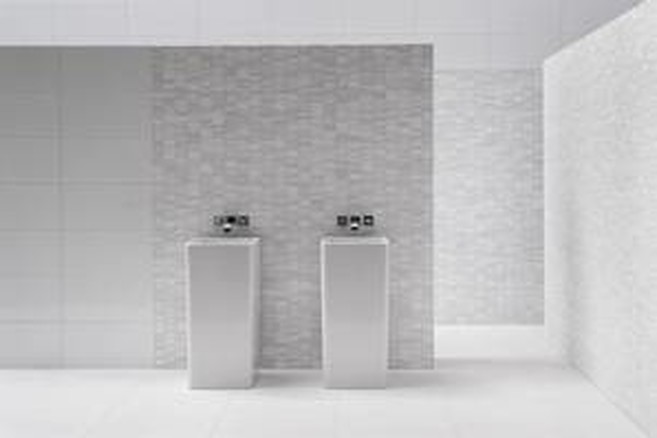 - Architectonisch lijnenspel: de basistegel wordt hierbij gecombineerd met een strokenpatroon van glanzend witte tegels in de formaten 10 x 60, 15 x 60 en 20 x60 cm. De patronen worden per set geleverd, zodat de verschillende tegels altijd dezelfde tint hebben.