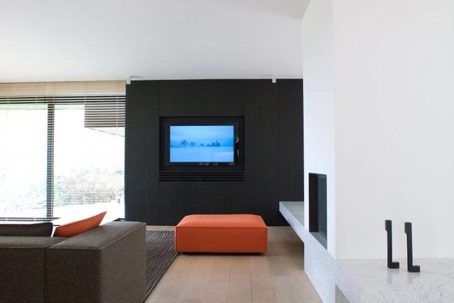 Het Art Nivoteam koos heel bewust voor sobere kleuren en materialen, die de rustgevende uitstraling van het gebouw versterken. Om tegelijkertijd ook enige dynamiek te creëren, zorgden ze in de woonkamer voor een opvallend kleuraccent. De grote, oranje poef kreeg een centrale plaats toebedeeld. Zo zorgt hij in één klap voor leven in huis, terwijl de rustige sfeer toch bewaard blijft. De mensen van Art Nivo gingen ook bewust op zoek naar lage meubels, omdat deze het vooruitstrevende karakter van het paviljoen nog extra in de verf zetten. Bovendien zorgen ze ervoor dat het uitzicht door de kamerbrede ramen niet belemmerd wordt. Ze werden zelfs zo geplaatst, dat de bewoners vanuit elke kamer een optimaal uitzicht hebben. Op die manier kunnen Paul, Els en hun twee kinderen het hele weekend lang genieten van het sublieme vergezicht.