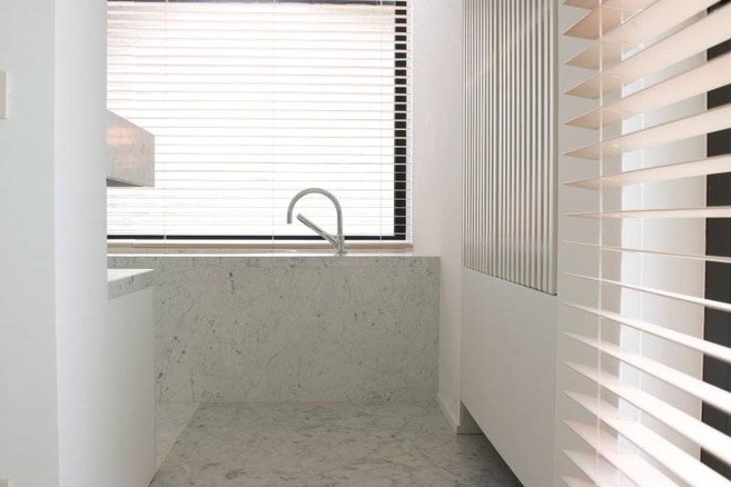 De architect zorgde dus vooral binnen voor een stevige basisafwerking. Hij liet een keuken en badkamer optrekken in een stijl die perfect past bij de aparte stijl van het paviljoen. Beide ruimtes zijn sober ingericht, maar toch vallen ze op dankzij het gebruik van kwalitatieve materialen. Zo werd in de badkamer en in de keuken een lichte marmersoort gebruikt die ook in de rest van het gebouw hier en daar terugkomt. In de keuken werd zelfs een schuifwand van marmer geïnstalleerd, waarachter de apparaten schuilgaan. Ook in de rest van het paviljoen werden uitsluitend kwaliteitsvolle en vaak weinig voorkomende materialen gebruikt. Voor de vloer werd licht eikenhout gekozen en verschillende wanden werden bezet met fineer van moeraseik, een materiaal dat niet zo vaak voorkomt en een sfeer van klasse en stijl creëert.