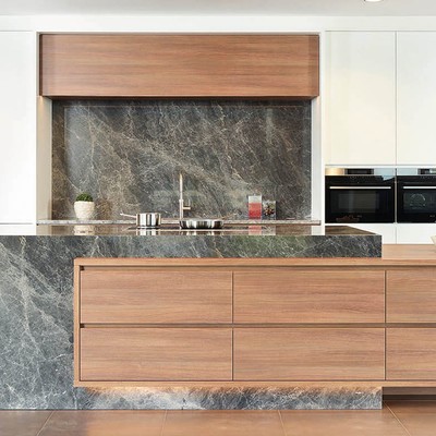 - Opgebouwd uit marmer, glas, inox, gres of lava