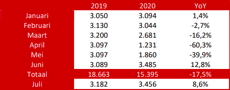 Over het gehele voorjaar waren 17,5% minder registraties dan in het voorjaar van 2019. Dat is geen goed teken voor de vele huishoudens die nog steeds op zoek zijn/moeten naar een nieuwe woning. Tellen we maand juli erbij, dan bedraagt de daling nog steeds 13,7% in vergelijking met de eerste zeven maanden van 2019.