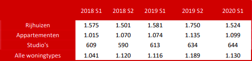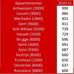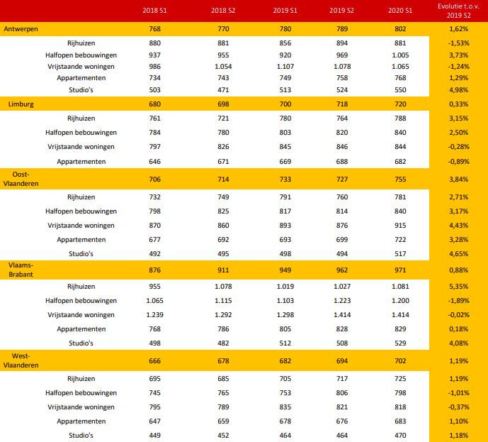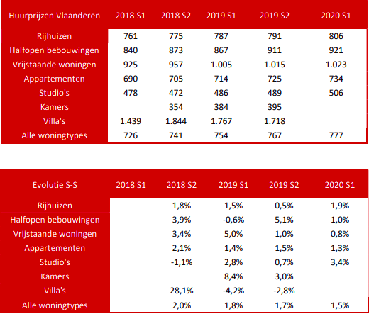 In het voorjaar van 2020 vielen 17,5% minder verhuringen op te tekenen ten opzichte van het voorjaar van 2019. In Vlaanderen stegen de huurprijzen over alle woningtypes heen met 1,5%. Bij de appartementen ging het om een prijsstijging met 1,3%, van €725 per maand naar €734 per maand. Die prijsstijgingen slaan dus wel op vergelijking met de laatste zes maanden van 2019 en niet meer op de eerste zes maanden van 2019. Vergeleken met die periode is de stijging respectievelijk 3,3 procent en 2,8 procent.