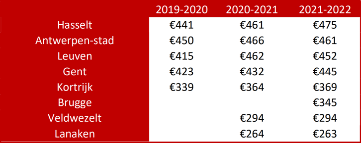 Onverwacht is dat Hasselt het voorbije academiejaar de duurste studentenstad was. Al lijkt dat misschien niet helemaal een verrassing. Hasselt zit van in het begin van onze datareeks in de kopgroep. Met een stijging van €15 is Hasselt ook de studentenstad waar de huurprijzen het felst gestegen zijn, gevolgd door Gent waar de gemiddelde huurprijs voor een studentenkamer €13 meer bedraagt. In Kortrijk en Antwerpen-stad zien we daarentegen een stabilisatie na de prijsstijgingen van de voorgaande jaren, terwijl we in Leuven gelet op de grote toename van het aantal verhuringen in onze databank best geen al te zware conclusies aan de gegevens verbinden qua prijsevolutie.