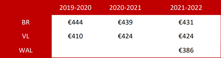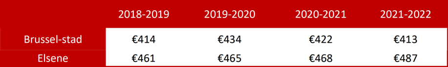 In het Brussels Hoofdstedelijk Gewest kunnen we meer in detail inzoomen op de huurprijzen van studentenkamers in Brussel-stad aan de ene kant en Elsene aan de andere kant. Daar waar sinds het vorige academiejaar in Brussel-stad de prijzen een duidelijk neerwaartse trend vertonen zien we een omgekeerd fenomeen in Elsene. Daar stellen we in het meest recente academiejaar zelfs nog een versnelling vast: een stijging met €19 ten opzichte van 2020-2021.