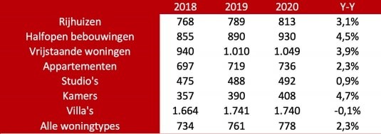 Bij de halfopen bebouwingen en de vrijstaande woningen zien we al jaren dat de prijsstijgingen vrij fors zijn en een stuk boven het niveau van de appartementen en de rijhuizen liggen. Aan de andere kant van het spectrum zijn de prijzen voor studio’s slechts met 0,9% toegenomen, onder het niveau van de inflatie. In 2019 was de gemiddelde huurprijs voor een studio nog met 2,7% gestegen.