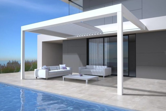 Skye is de nieuwste en meteen meest exclusieve telg in het assortiment terrasoverkappingen van Renson. Bijzonder aan de nieuwkomer is zijn dak in aluminium lamellen. Deze lamellen kunnen roteren en opengeschoven worden. In gesloten toestand bieden ze bescherming tegen regen, zon of wind. Wanneer het dak open is, kan warme lucht ontsnappen of – in de winter – kunnen dag- en zonlicht tot diep in de woning dringen.