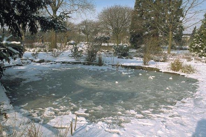 - Op een bevroren vijver hakken of lopen is nefast voor de vissen. De trillingen kunnen de zwemblaas ernstig beschadigen. Je kan een gedeelte van de vijver ijsvrij houden een stuk isolatie en een pvc buis door voor de afvoer van gifgassen uit de rottingsprocessen. Er bestaan ook elektronische apparaten om de vijver ijsvrij te houden