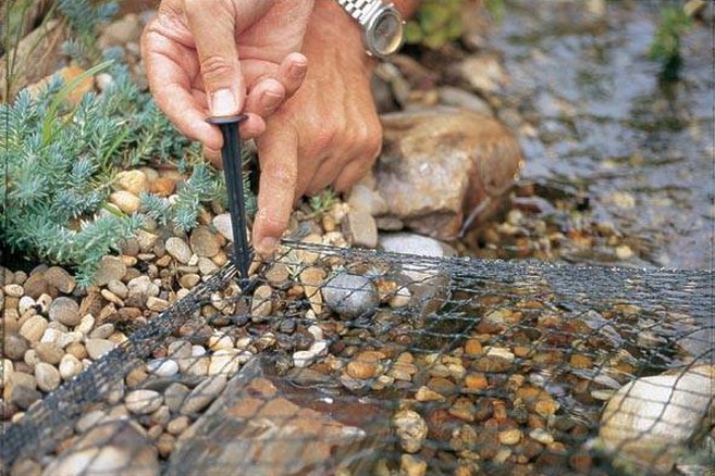 - Een andere optie is te vermijden dat bladeren in het water kunnen terechtkomen. Dit door een fijnmazig net als een tent over de vijver te spannen. De bladeren glijden zo naar de zijkanten waar je ze gemakkelijk kan verzamelen