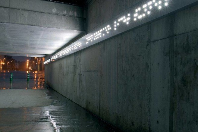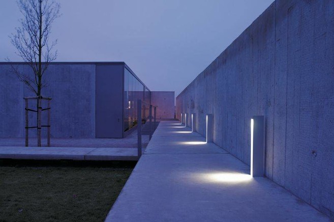 Monopol, in de vorm van een smalle balk en open aan de voorzijde, geeft heel gericht licht en zorgt zo voor de noodzakelijke oriëntatieverlichting. Aan de bovenkant van de balk bevindt zich de lamphouder, aan de voorkant afgeschermd door een gelakt inox plaatje. De led-lampbron maakt deze armatuur bijzonder zuinig.