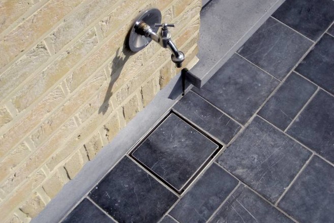De vloerafvoerput, verkrijgbaar met een verticale of een oriënteerbare horizontale uitloop voor aansluiting op de riolering, heeft een makkelijk uit te nemen en te reinigen waterslot. Het geheel wordt vastgezet in de stabilisé die dienst doet als ondergrond voor de blauwe hardsteen.