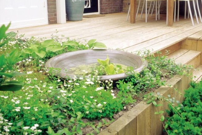 Een groen terras zorgt ervoor dat je stilaan het groene gevoel van binnen naar de tuin doet overlopen. Beplanting tussen de terrastegels is wel mooi, maar niet erg praktisch omdat je zo je meubilair niet kunt verplaatsen naargelang het aantal gasten. Plaats zeker één of enkele planten die kunnen overwinteren.