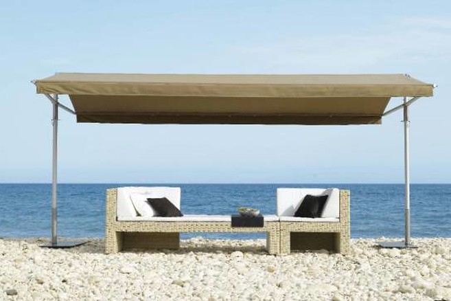 Voor schaduw van formaat zorgt Papillon, een extragrote overkapping (3 bij 5 meter) die zich makkelijk laat oprollen. Het doek is behandeld met een speciale tefloncoating, waardoor regendruppels gewoon van de parasol parelen. Geen plensbui die je goed humeur kan verstoren dus! Wie extra veel schaduw wil, kan twee of meerdere Papillons aaneenschakelen, in de lengte of langs elkaar. Daarvoor zijn specifieke metalen voeten en gootjes verkrijgbaar. Bovendien kan je het geheel uitbreiden met een sidewall die extra beschutting geeft.