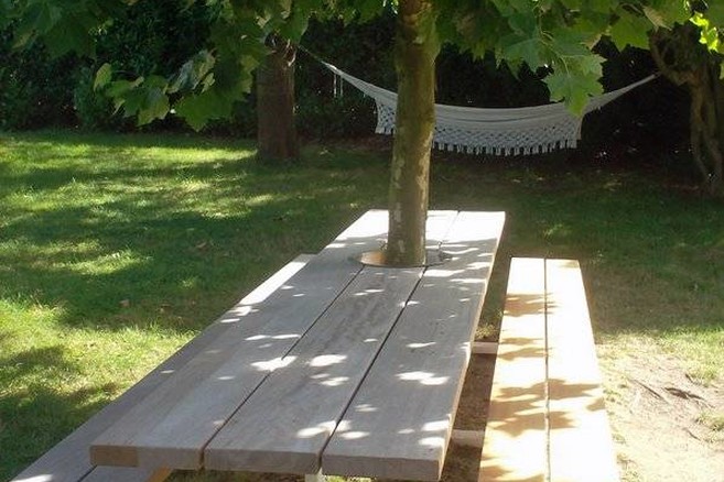 Graag met zijn allen aan de tuintafel omheen je lievelingsboom? Dan is de Cassecroute Table beslist een opvallend en uniek exemplaar! Want er zit een gat in waar je lievelingsboom ongestoord doorheen kan groeien. De tafel bestaat in gelakt hout of in onbehandeld natuurlijk hout en is gemaakt van Afrikaanse iroko met ecologisch label. Het metalen onderstel is gemaakt uit elektrolytisch gegalvaniseerd staal met een polyester poedercoating. De balken zijn voorgeboord waardoor je geen barsten maakt in het hout. De meubels worden gemaakt door een Vlaams duo dat zijn sporen in de tuinmeubelsector meer dan verdiend heeft. Het leuke is dat de meubels zo stevig en leuk zijn dat je toekomstige kleinkinderen en hun kinderen er ook nog plezier aan zullen beleven. De meubels worden aan een eerlijke prijs verkocht, door de makers zelf. En je kan ze in het atelier gaan afhalen, waardoor je flink bespaard op kosten voor vervoer.
