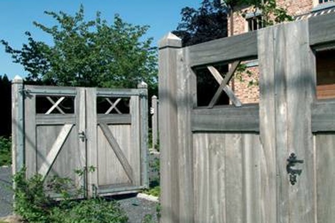 Het assortiment poorten in massieve padoek omvat voor elk wat wils: een schuifpoort en 6 opendraaiende poorten.