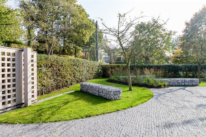 De voortuin bestaat uit een grote parking omgeven door schanskorven in asymmetrische lijnen geplaatst. Hierachter zijn partijen grassen (miscanthus en molinea) geplant. De bestaande fruitbomen zijn er ook in verwerkt.- Dit tuinproject is een realisatie van Tuinen Daenekindt