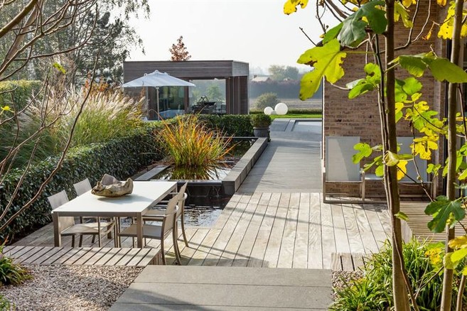 Aan water is er geen gebrek in de tuin met zowel een grote vijver als zwembad.- Het overloopzwembad is een ter plaatse gegoten betonnen kuip. Deze is bezet met mozaïek. Erlangs pronkt een modern poolhouse in hardhout met veel glas. Wanneer de ramen open staan, lijkt het poolhouse te zweven. In het poolhouse is een toilet, douche en een moderne bar ondergebracht