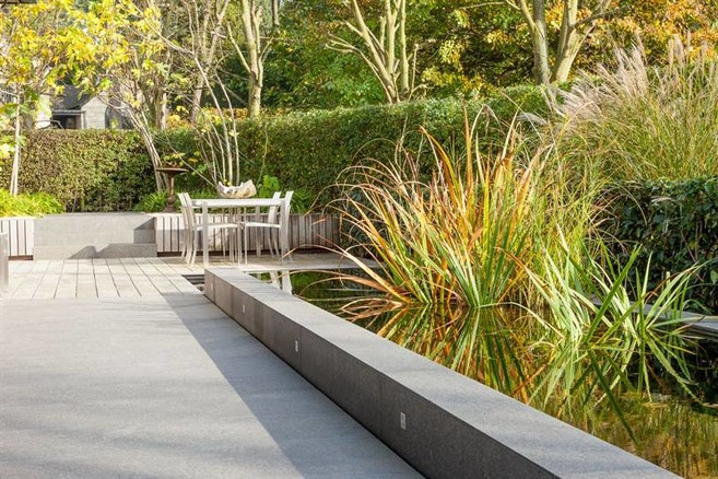 In de tuin moest een hoogteverschil van 2,5 meter worden weggewerkt. De tuinarchitect verwerkte alle wensen zonder er een te drukke tuin van te maken. Alle elementen vloeien mooi in elkaar over. Alles is mooi uitgelijnd, zodat bijvoorbeeld de voegen van de tegels doorlopen in de overlooptegels van het zwembad.Overloopzwembad en koivijver