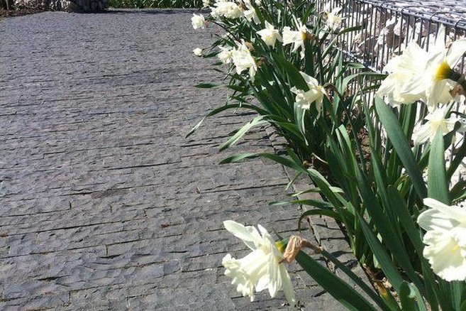 - De gekloven basaltklinkers liggen zowel op de oprit als de tuinpaden