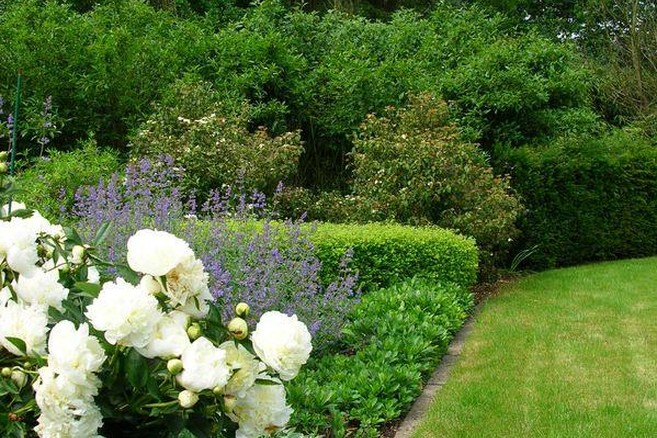 Vanop het terras merk je bijna geen paadjes op, in deze tuin moeten het groen van de tuin en de omgeving ten volle tot hun recht komen. Een wandeling op het gras tussen de verschillende vaste planten en heesters geven een gevoel van rust.