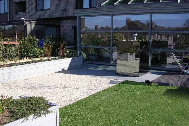Op het dak van de achterbouw is eerst een veranda geplaatst. Hierop vertrekt een terras in composiet terrasplanken. Dit materiaal is ook gebruikt om alle plantenbakken aan te kleden. Rondom de bestaande schoorsteen is een terras met granieten tegels aangelegd. Een grindpad en kunstgras sluiten hierop aan.De meest opvallende elementen in deze tuin zijn: de verhoogde plantenbakken met vaste beplanting (lavendel, funkia, purperklokje) en de verschillende bloeiende heesters (bruidsbloem, hortensia's, spierstruik).
