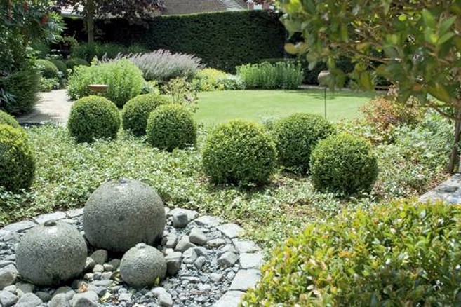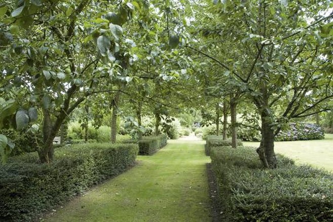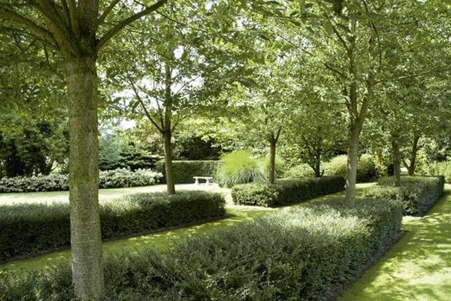 De tweede en derde fase richtten zich op de rest van de tuin. In het ‘oude’ deel – het deel dat al tot de tuin behoorde voordat de eigenaars de extra lap grond kochten – kozen Jeannine en Alfred voor rechte lijnen en vierkante kamers. Eén centrale as loopt van aan de grote oranjerie tot aan de achterkant van de tuin. Op het eerste gezicht lijkt dit concept vrij eenvoudig, want wanneer we vóór de tuin staan, krijgen we de indruk van een zeer grote tuin zonder meer. Wanneer we ons echter op de centrale as begeven en een stuk verder in de tuin trekken, verandert het hele beeld. “Dat was min of meer onze bedoeling”, verklaart Alfred. “Wij wandelen graag door onze tuin en we willen daarbij telkens verrast worden. Om die reden hebben wij een tuin waarbij we eigenlijk van het ene deel naar het andere kunnen kijken – onder meer door zijassen op de grote centrale as en door niet al te hoge hagen – maar toch dat andere deel niet volledig kunnen zien. Zo is het goed mogelijk dat we een volledig ander beeld van de tuin krijgen wanneer we in een ander stuk staan.”